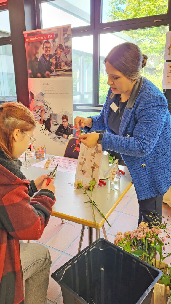 Die Metallbauer*innen luden zum Basteln kleiner Metall-Elefanten ein, die Gärtner*innen und Garten- und Landschaftsbauer animierten zum Mitmachen bei Pflasterarbeiten und zur Herstellung von Topfpflanzen, und die IT-führte in das Programmieren von präsentierte ein selbst entwickeltes Computerspielen ein. In der Berufsvorbereitung waren Kreativität und Feingefühl gefragt – hier konnten die Jugendlichen beim Blumenstecken ihr handwerkliches Geschick zeigen.